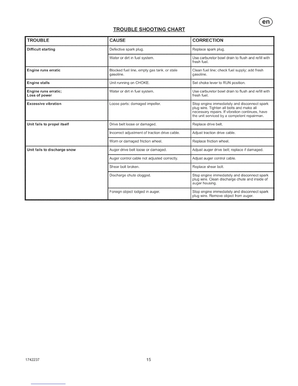 TROUBLE SHOOTING CHART