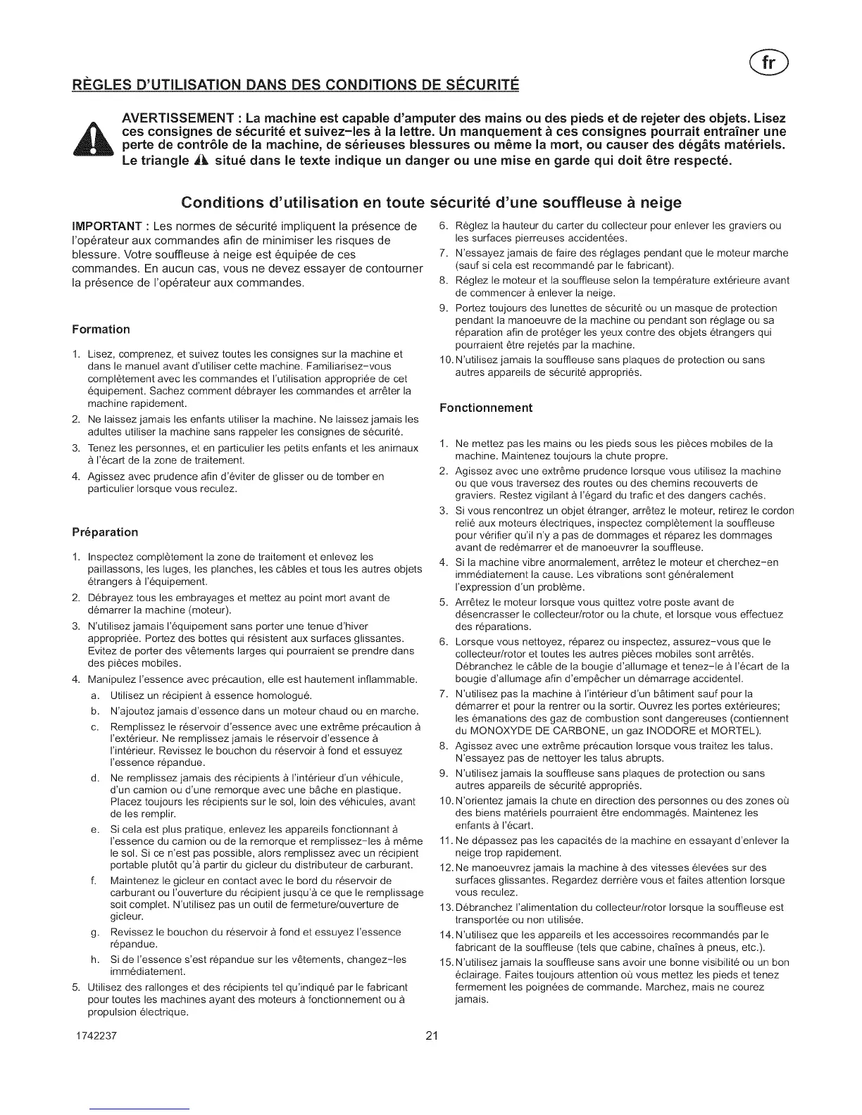 15. N'utilisez jamais la souffleuse sans avoir une bonne visibilit_ ou un bon