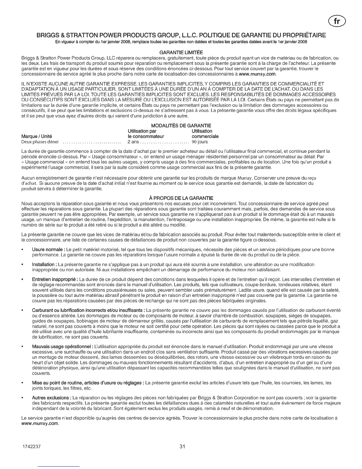 BRIGGS & STRATTON POWER PRODUCTS GROUP, L.L.C. POLITIQUE DE GARANTE DU PROPRII_TAIRE