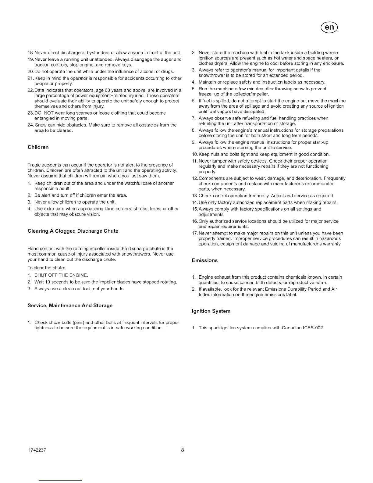 19.Neverleavearunningunitunattended.Alwaysdisengagetheaugerand
