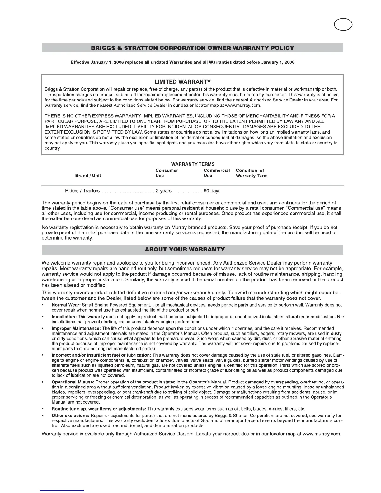 Murray 405028X51 - Limited Warranty