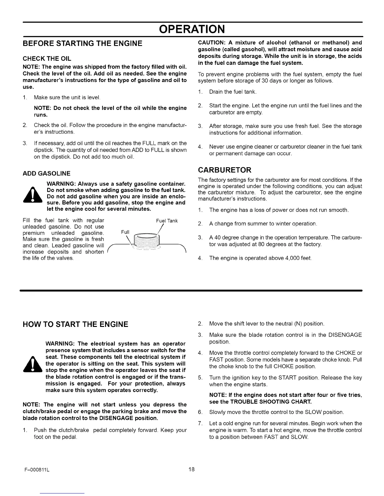 4. Never use engine cleaner or carburetor cleaner in the fuel tank