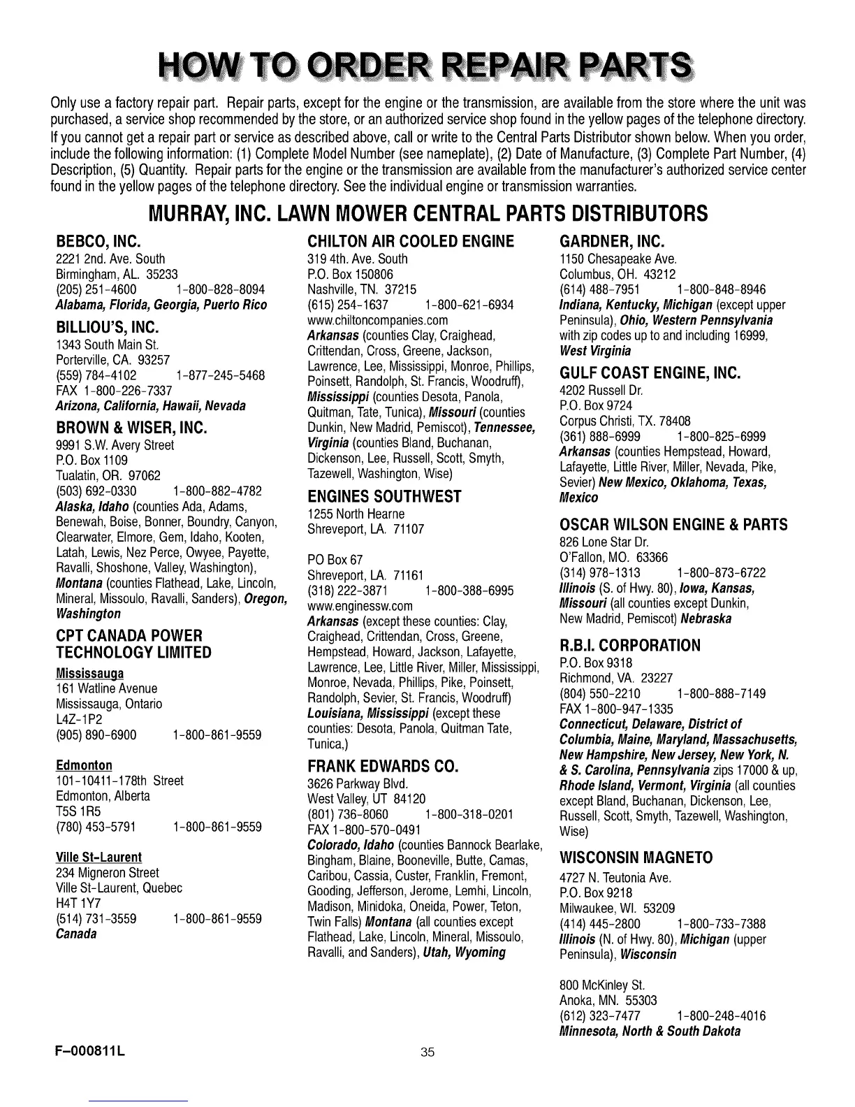 If you cannot get a repair part or service as described above, call or write to the Central Parts Distributor shown below. When you order,