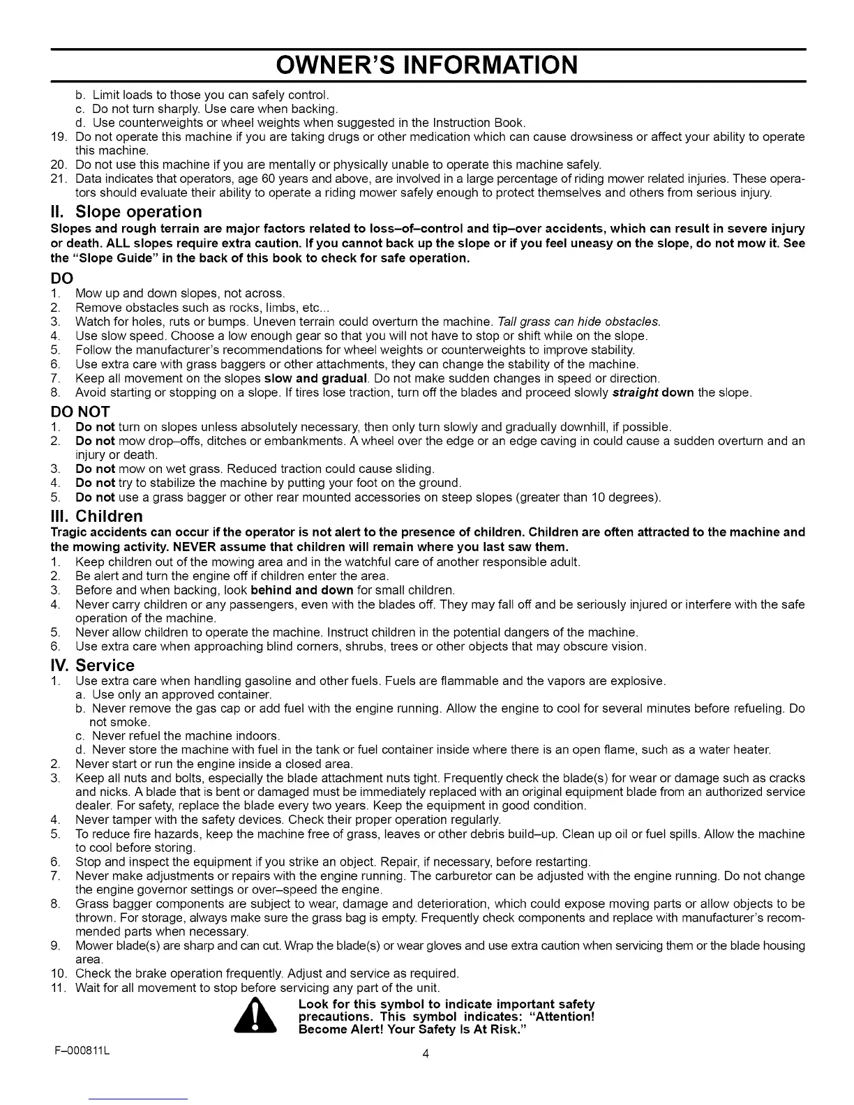 5. Do not use a grass bagger or other rear mounted accessories on steep slopes (greater than 10 degrees).