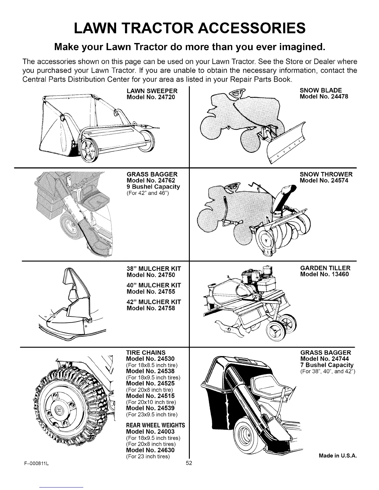 The accessories shown on this page can be used on your Lawn Tractor. See the Store or Dealer where