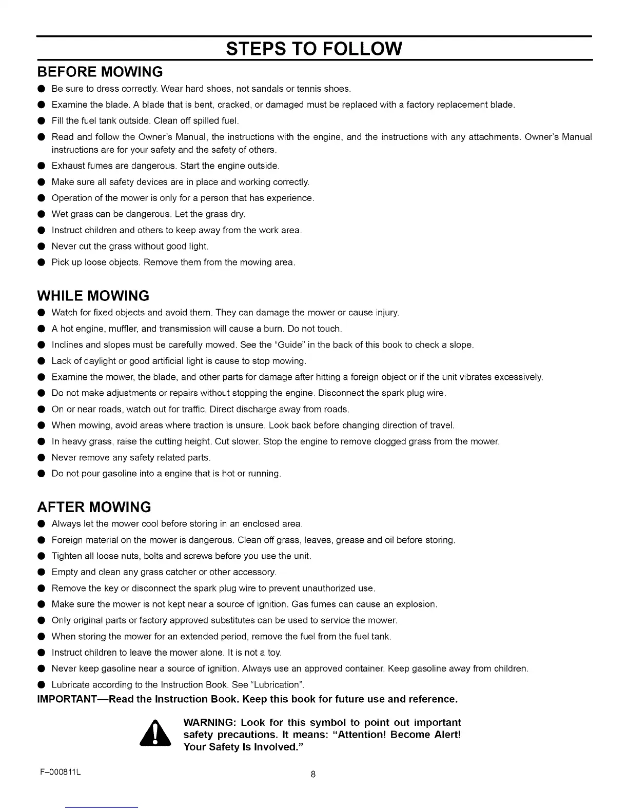 Read and follow the Owner's Manual, the instructions with the engine, and the instructions with any attachments. Owner's Manual
