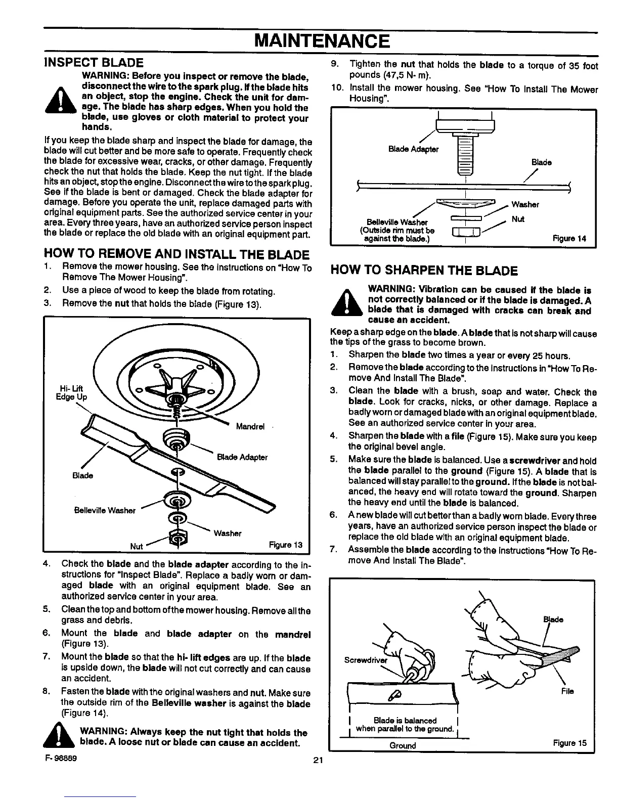 balanced willstay parallel to the ground. Ifthe blade is not bal-