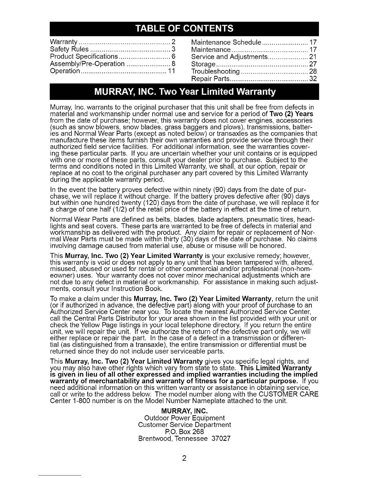This Murray, Inc. Two (2) Year Limited Warranty is your exclusive remedy; however,