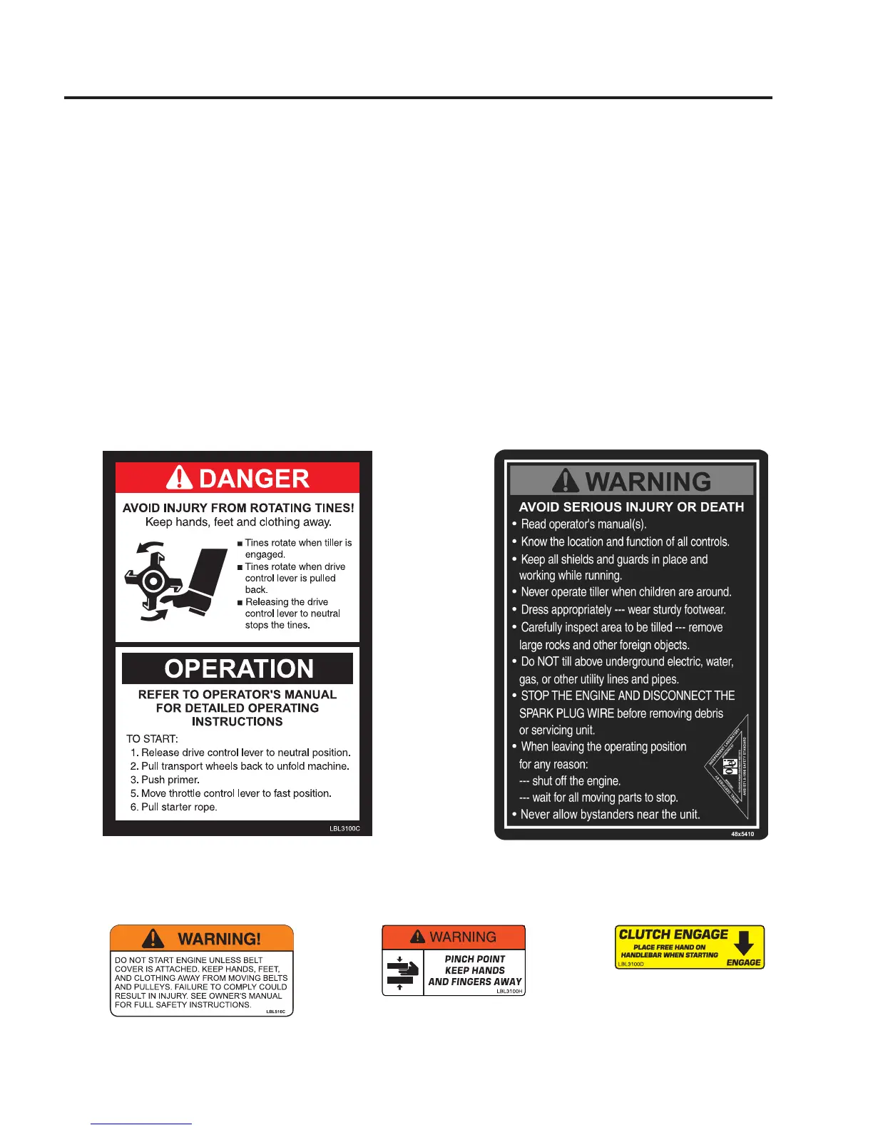 content of the safety messages you will see as you perform normal tilling operations. Please review these labels now,