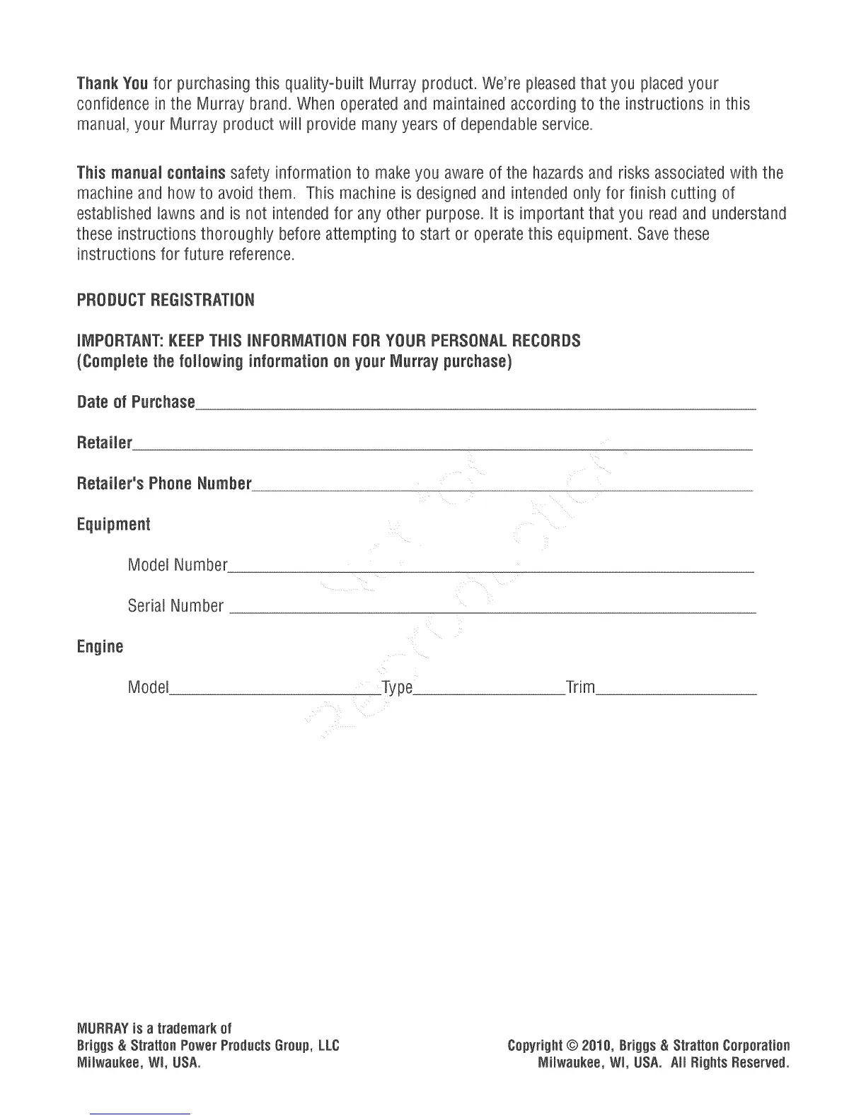 ThankYoufor purchasingthis quality-built Murray product. We're pleasedthat you placedyour