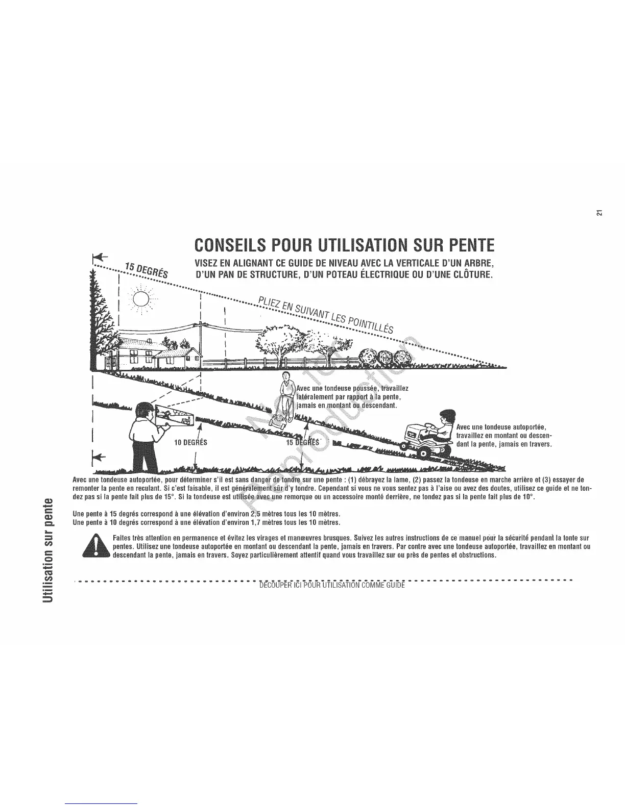 pentes.Utiiisezunetondeuseautoport6eenmontantoudescendantla pente,jamaisentravers. Parcentreavecunetondeuseautoport6e,travaiiiezen montantou