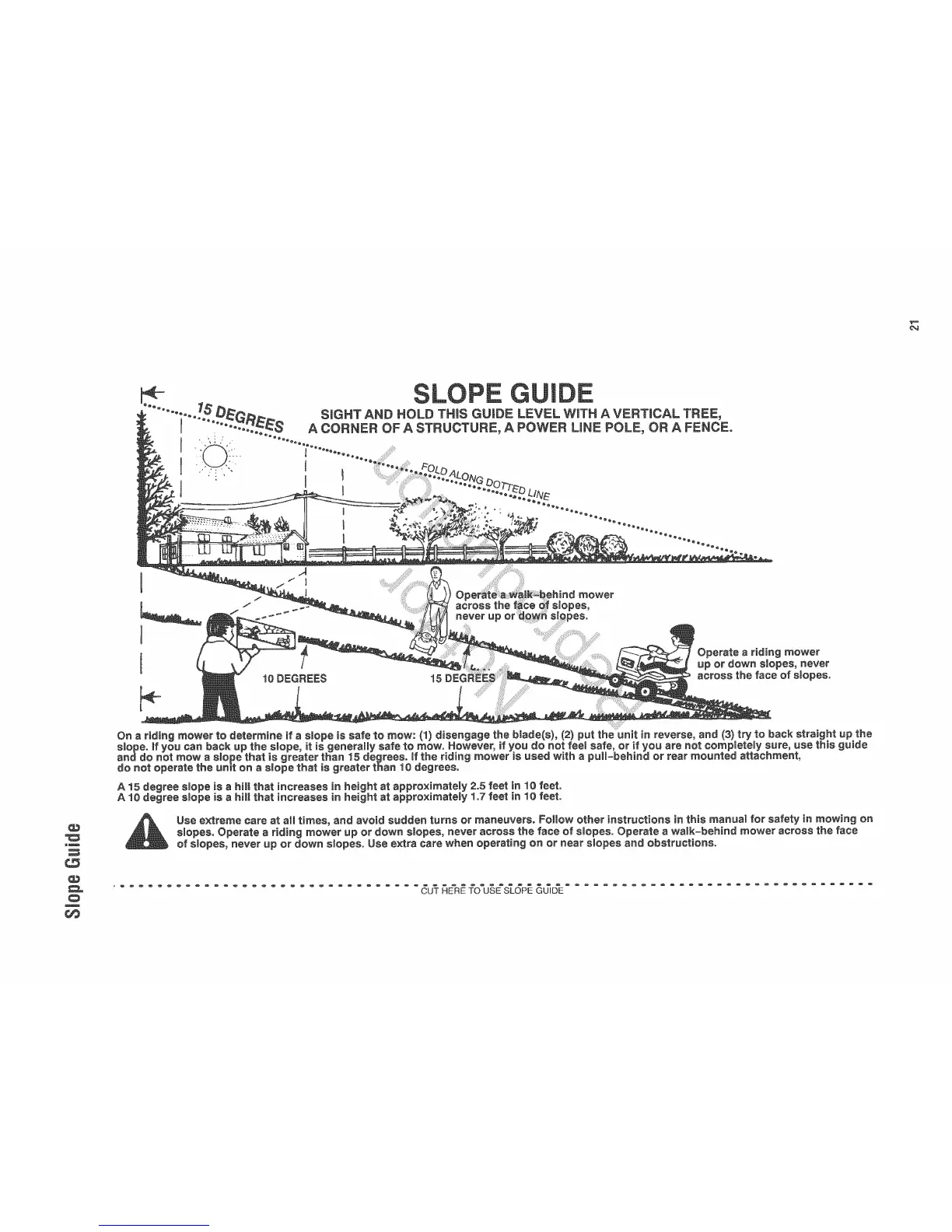 of slopes, never up or down elopes. Use e_ra care when operating on or near slopes and obstructions.