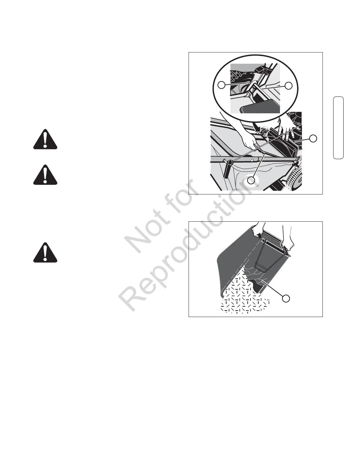 1. Para montar la bolsa de césped en el cortacésped, levante la