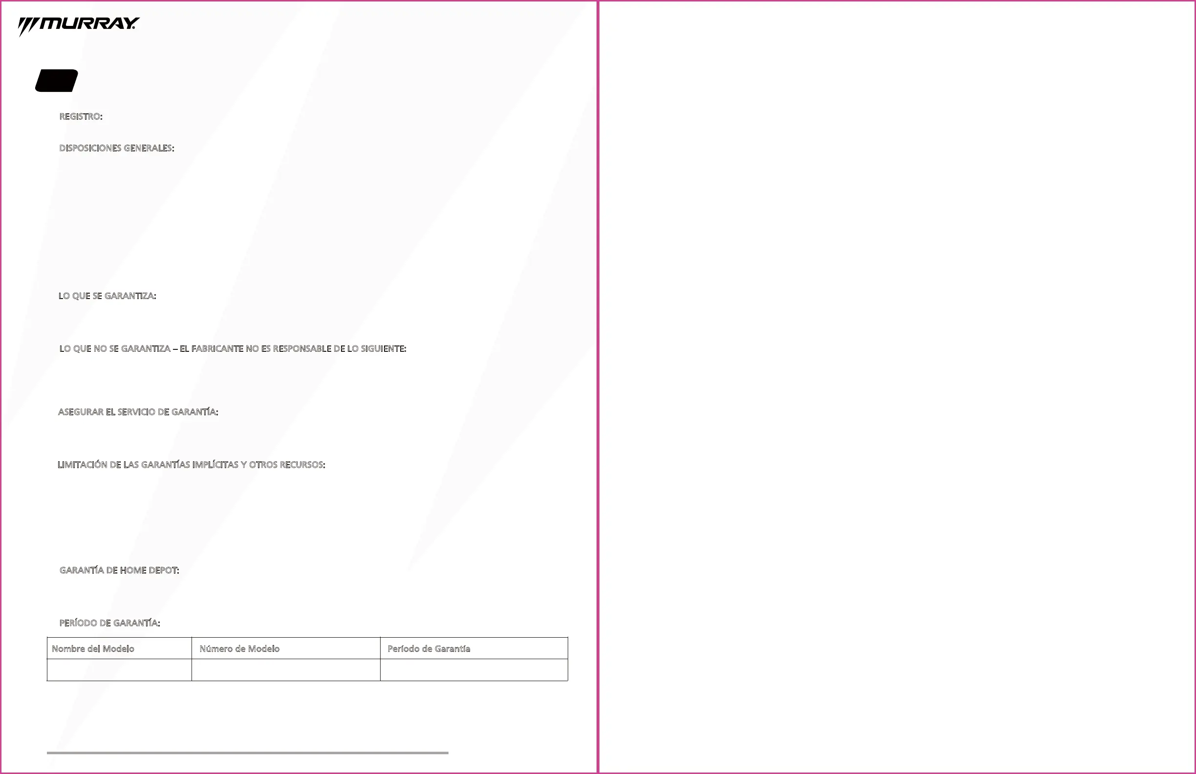 A. REGISTRO: Por favor registre su tractor cortacésped Murray MT100 en un plazo de 60 días a partir de la fecha de compra.