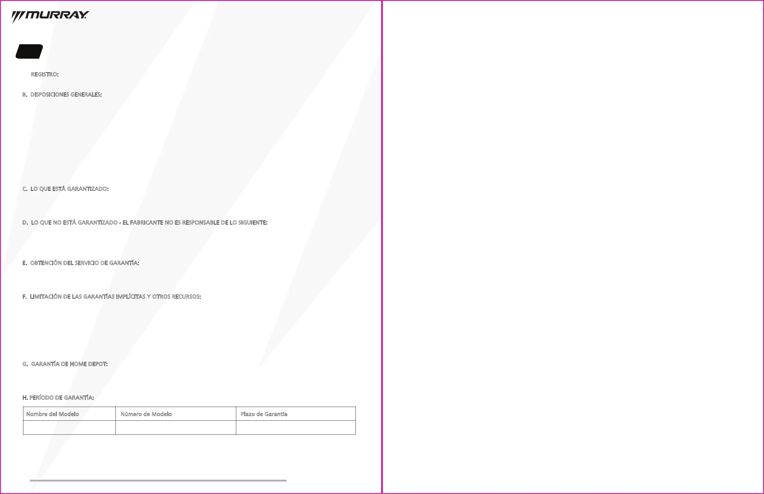 A. REGISTRO: Por favor, registre su tractor de césped Murray MT200 dentro de los 60 días siguientes a la fecha de compra. Vaya a