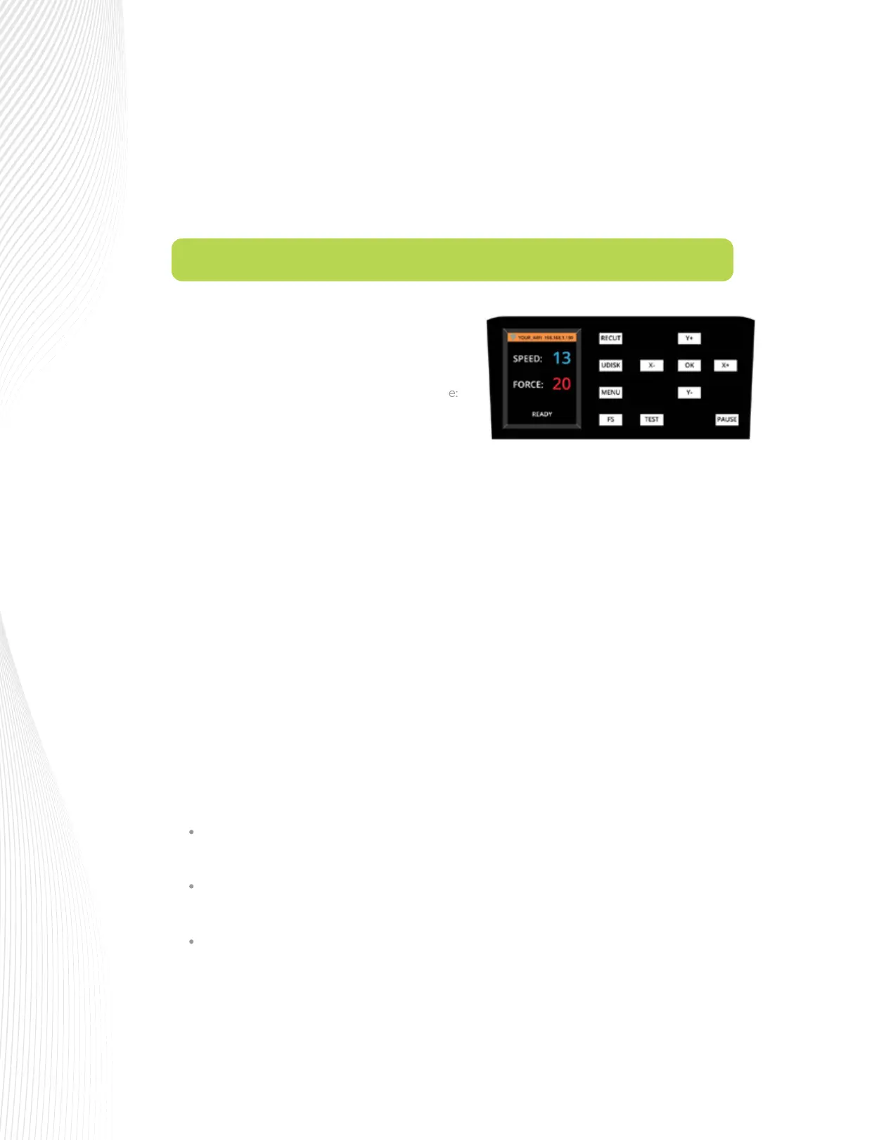 PAUSE: Pressing this button will pause the cutting process in case any changes need to be made.