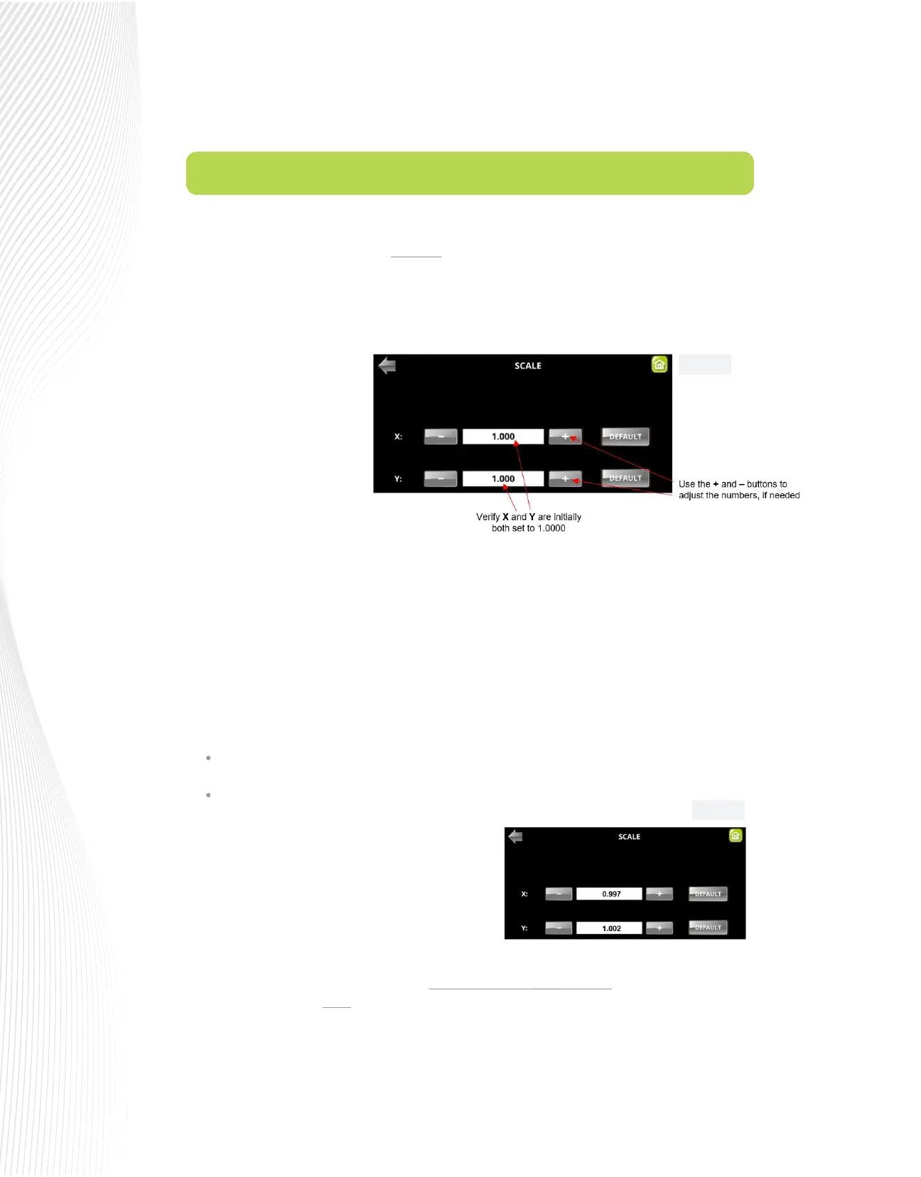SCALE screen. Then enter those new SCALE values and test again.