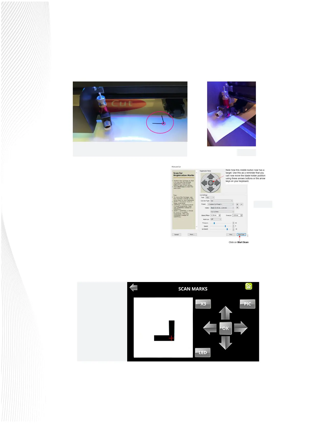 reason, the cutter fails to scan a particular mark, the camera display will show how far o-center the alignment