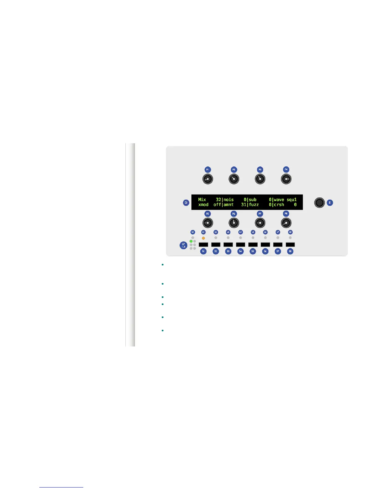 synthesis parameters accessible by the 8 potentiometers