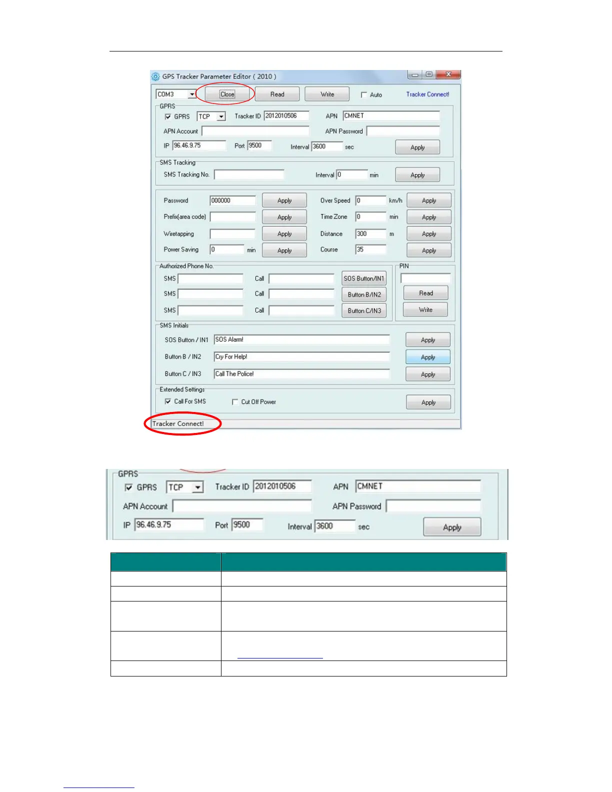 Note: GPRS, IP, Port is the default. You must change the APN, Tracker ID;