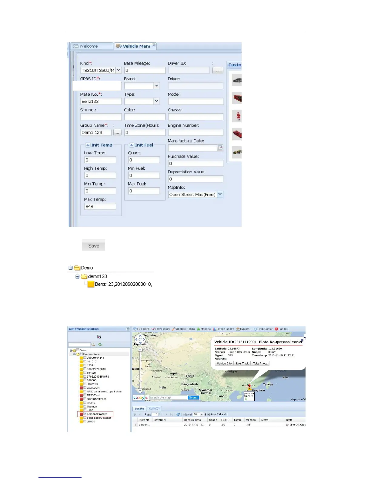 click , then you can see group ‘demo123’ and vehicle ‘Benz123’ with tracker ID