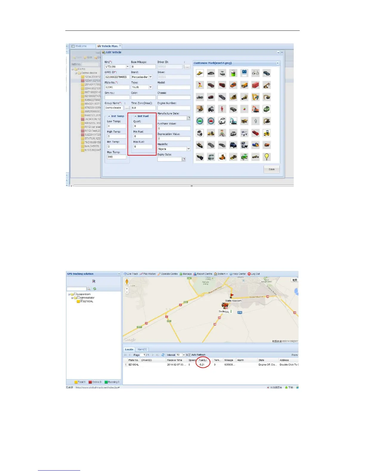 (1) Fill it up with fuel/oil in fuel tank. Let the tracker working. Then track the fuel(L) on platform: