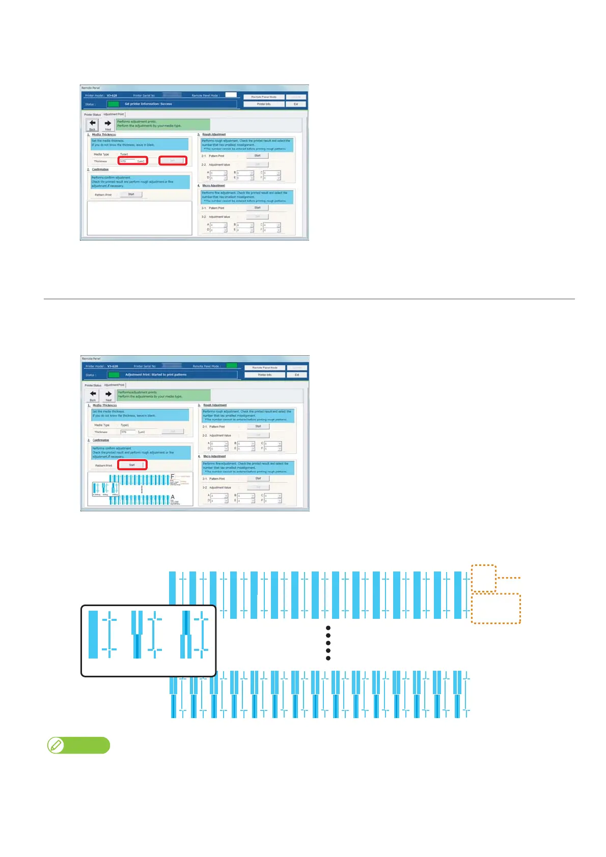 Check from Pattern A to Pattern F, and if there are misalignments, proceed to "Rough adjustment" on page 25.