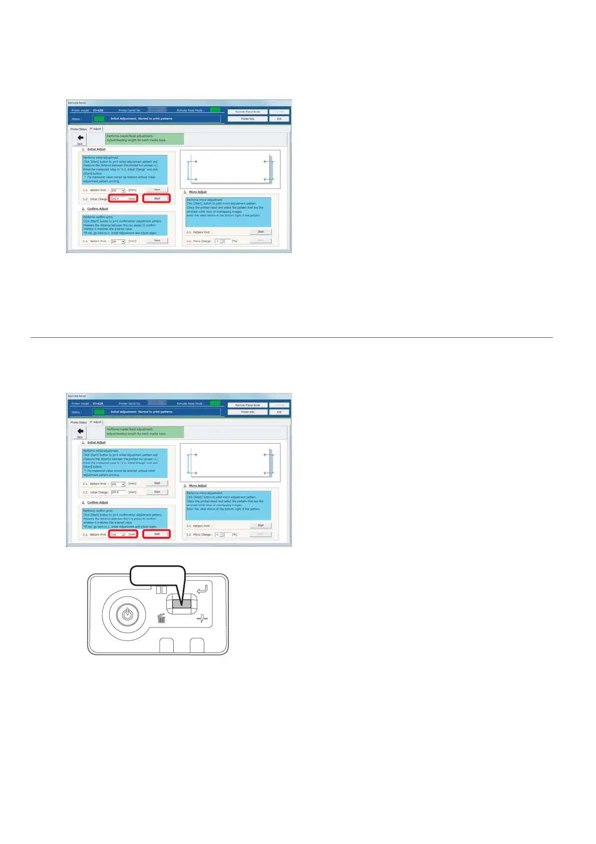 In [2. Confirm Adjust], select a length ([mm]) of [2-1. Pattern Print] from the dropdown menu, and click [Start].
