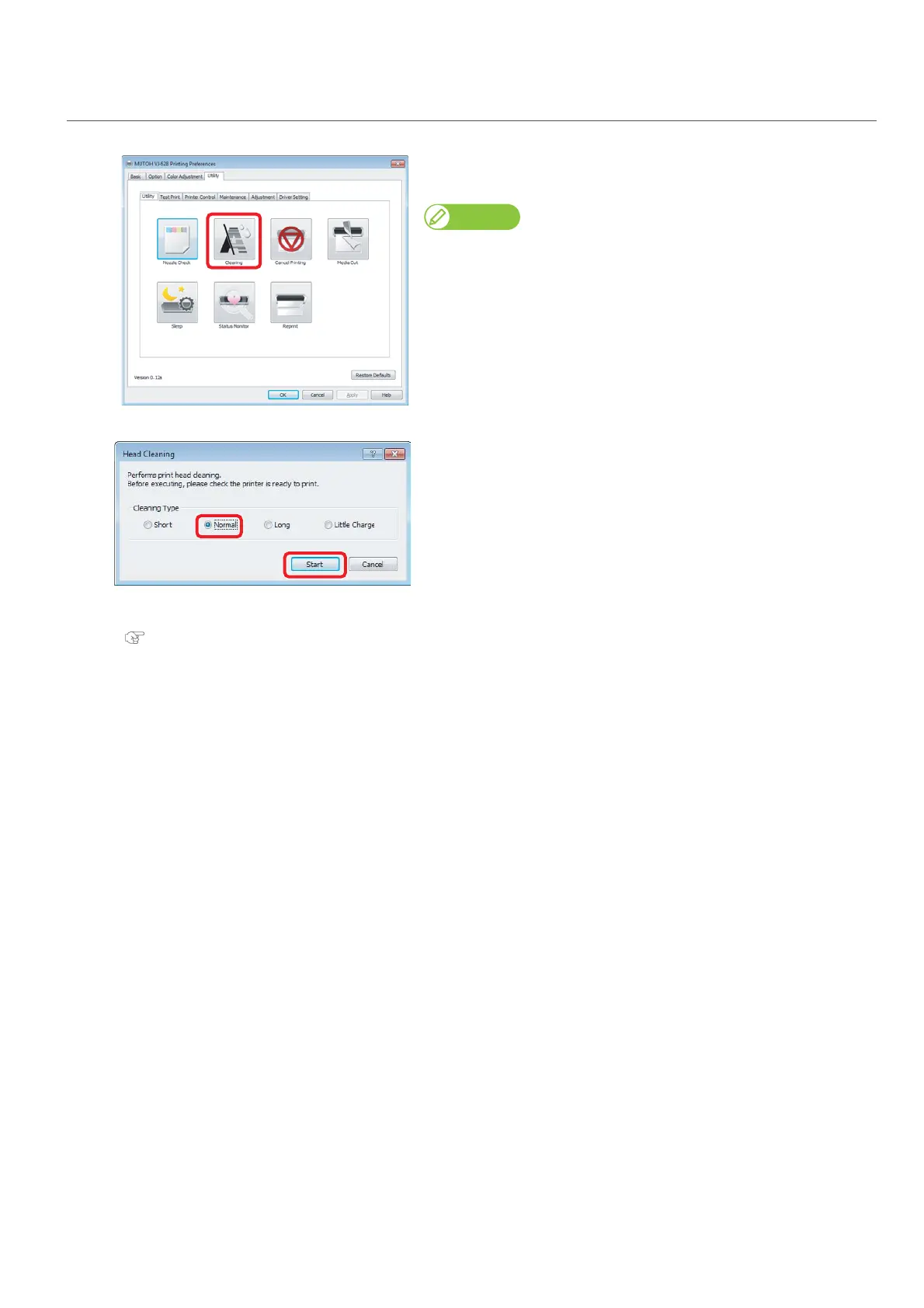 • If there is still nozzle clog, repeat [Normal] cleaning. Refer to "Head cleaning" on page 58 for [Short], [Long] and [Little
