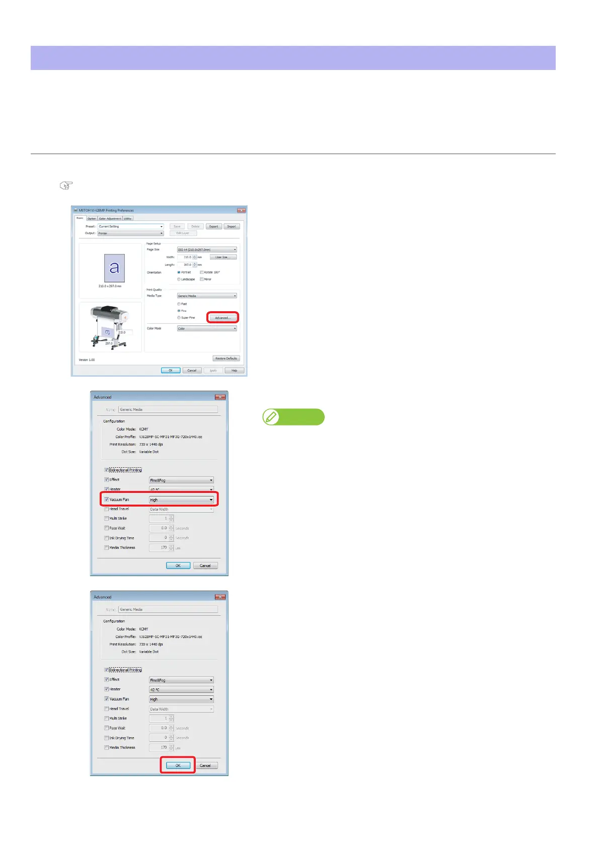 When printing on thin media or media without stiffness, it can prevent wrinkles or media jamming, if the vacuum fan is set to