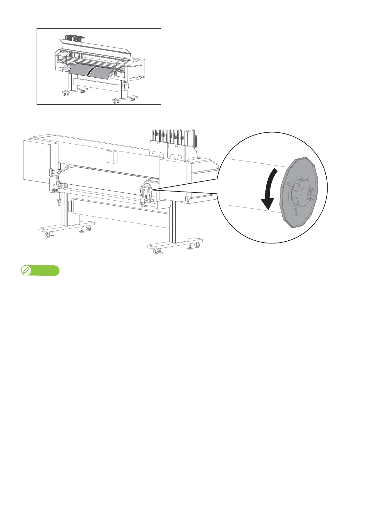 While one person holds the front edge of the media, the other person turns the flange to slightly rewind the media