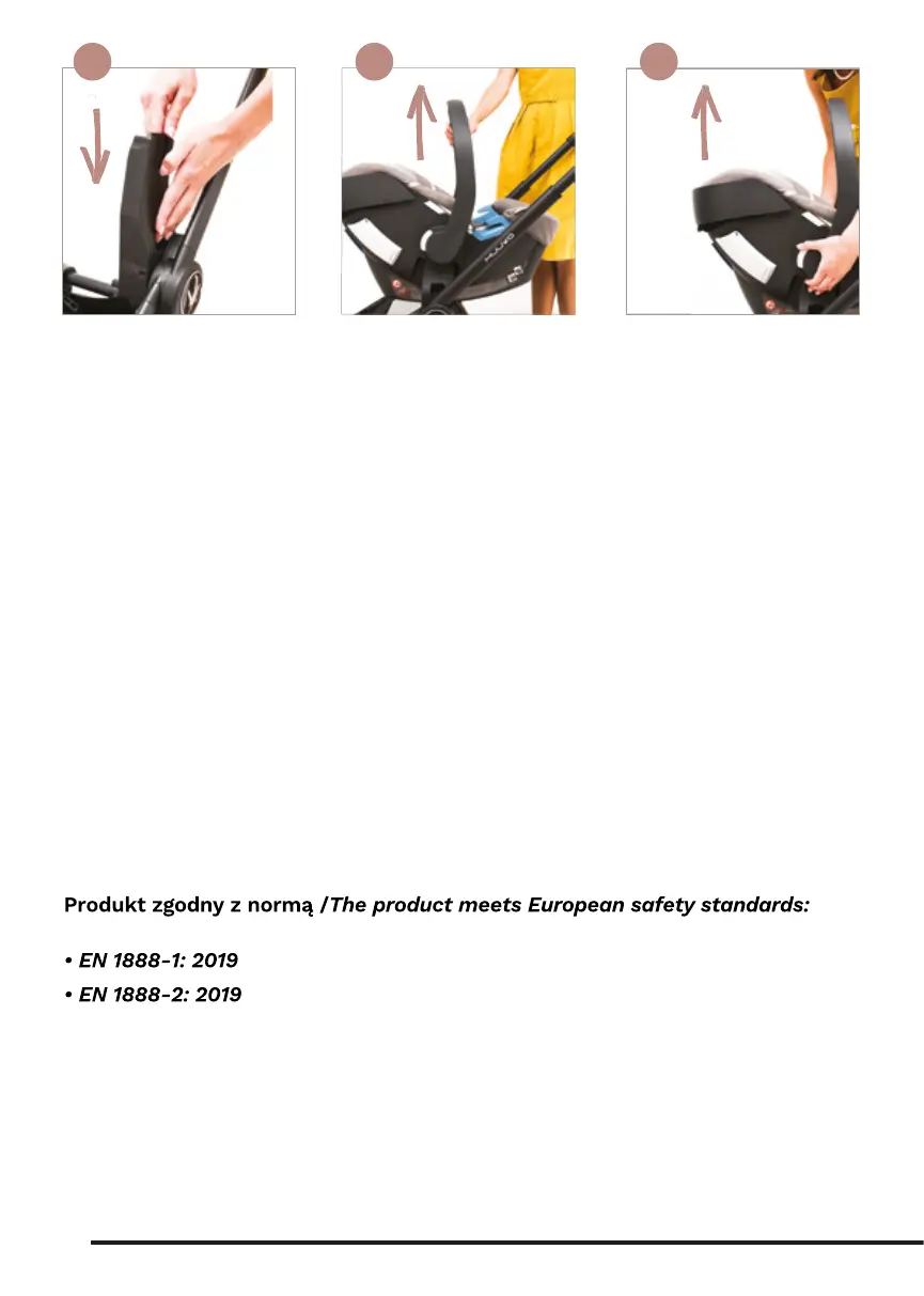 1) Usuń adaptery zramy wózka, naciśnij przyciski wadapterach jak na zdjęciu 24 ipodnieś fotelik