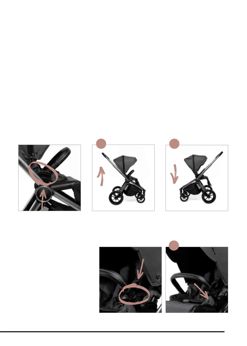 2) Aby zamontować siedzisko tyłem do kierunku jazdy, naciśnij przycisk ipodnieś siedzisko