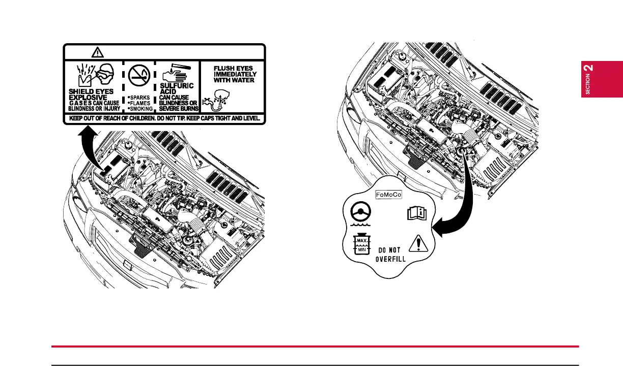This warning is located on both of the battery caps. This warning is located on the steering fluid reservoir cap.