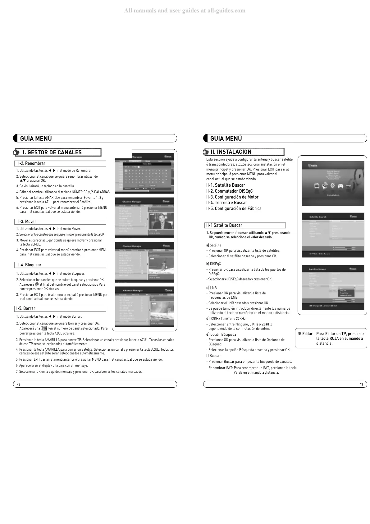 4. Presionar la tecla AMARILLA para borrar un Satélite. Seleccionar un canal y presionar la tecla AZUL. Todos los