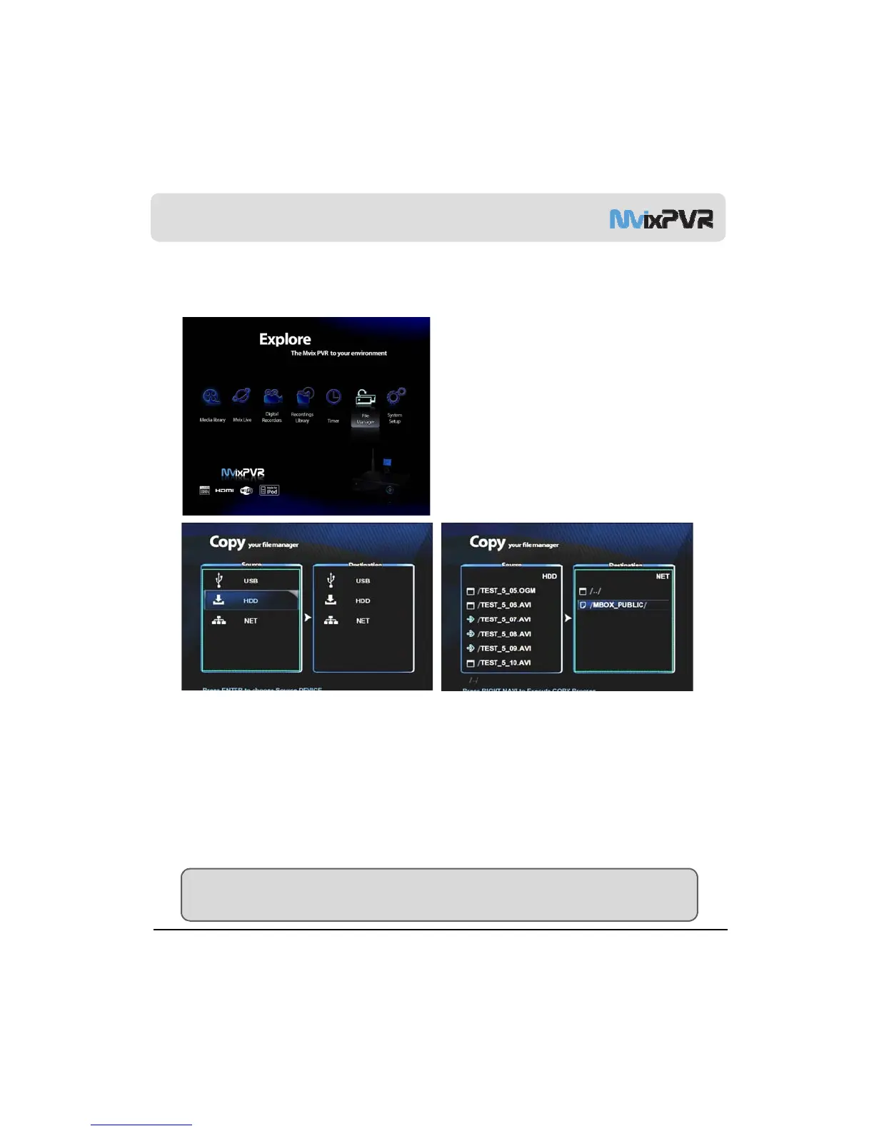 MvixPVR supports the function to conveniently copy files among USB/ HDD/ NET only with a remote controller.