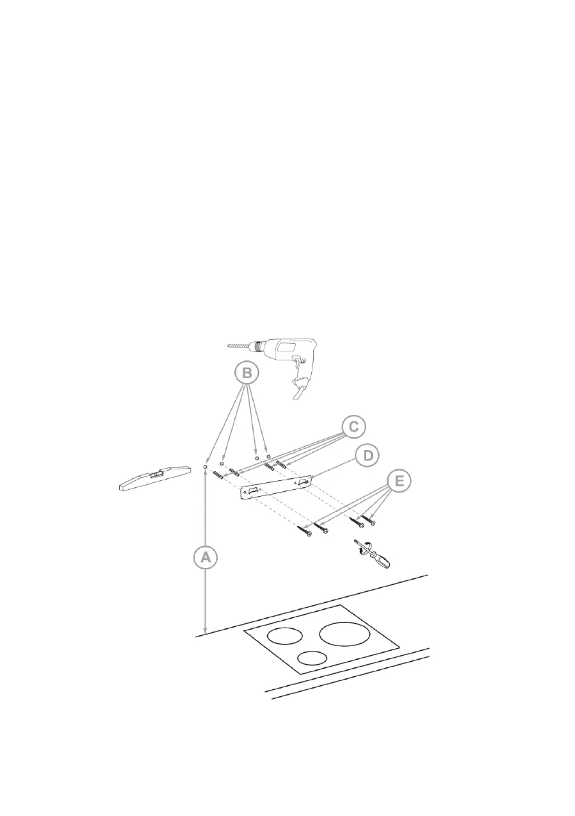 d) Fixez le support D et fixez-le au mur à l'aide des vis fournies E.