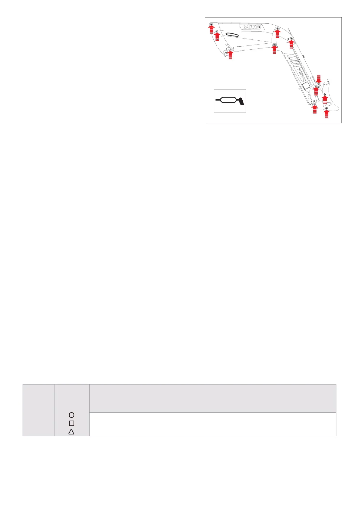 — The condition of the loader's pivot points. As required, replace wear bushes and/or the pins.