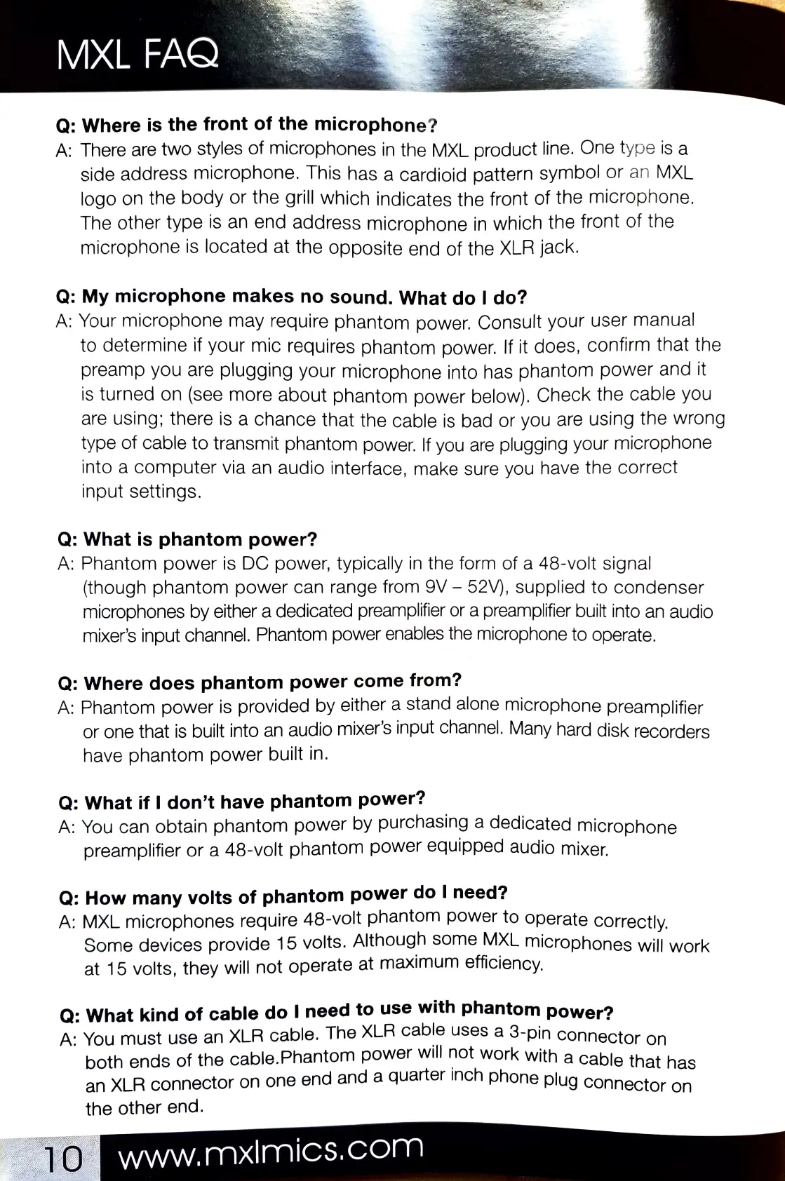 MXL V67g - MXL FAQ; Troubleshooting No Sound; Phantom Power Explained; Phantom Power Requirements