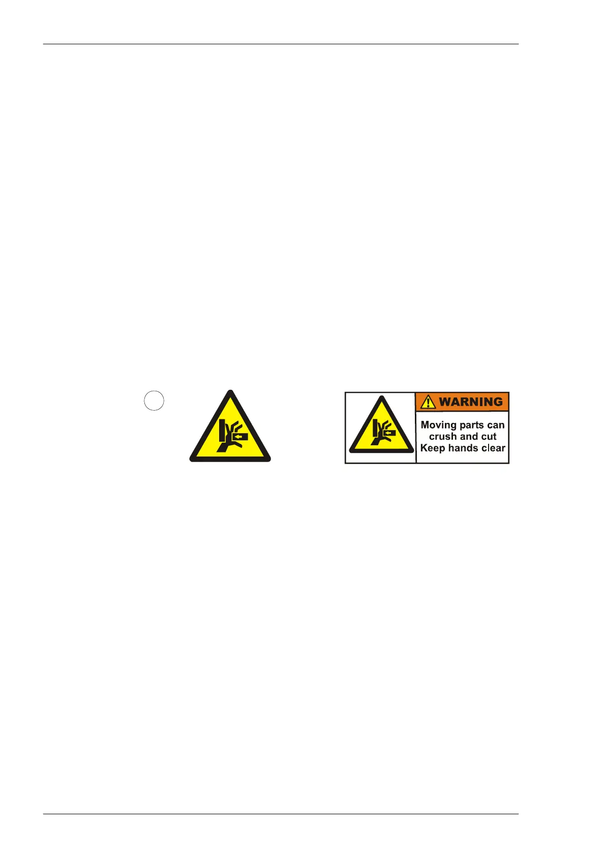 Sign 1 warns of the fast machine movement. No hands, fingers, or other
