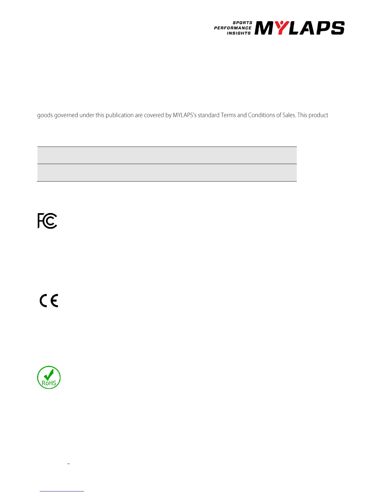 MYLAPS for loss, damage or injury caused by any errors or omissions in this document. The sale of products, services of