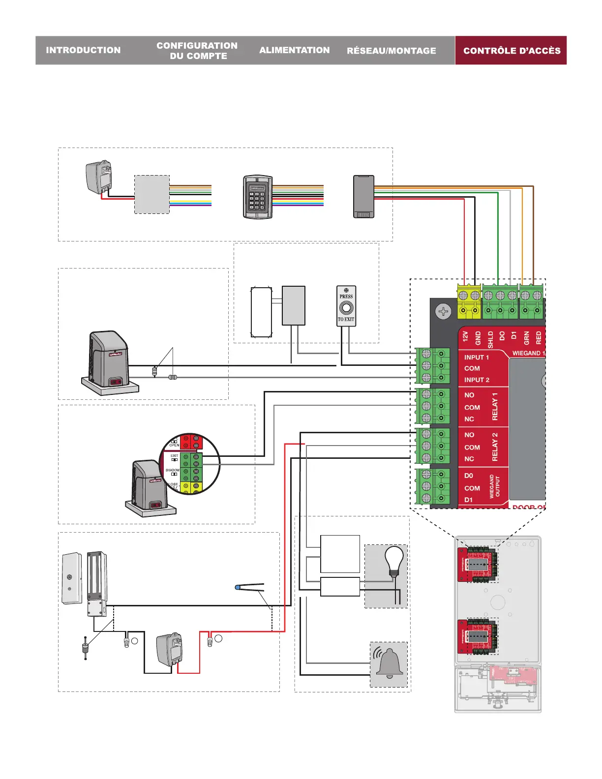 portail d’accès. L’accès au portail peut être câblé au relais 1, 2, 3 ou 4 de la porte de la carte de contrôle. Les opérateurs de portail