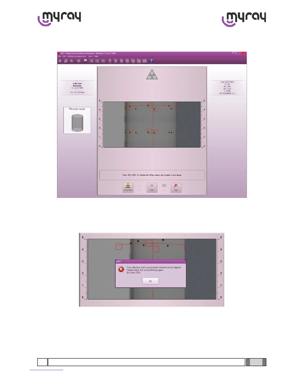 A scout image will be acquired, showing the current position of the metallic spheres mounted on it.