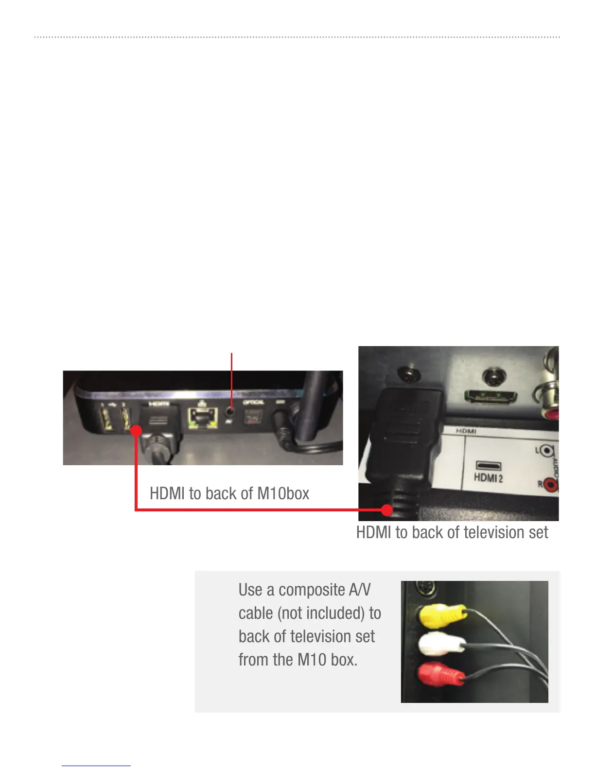 Connect mySDATV box to television set. Use included HDMI or Composite (A/V)