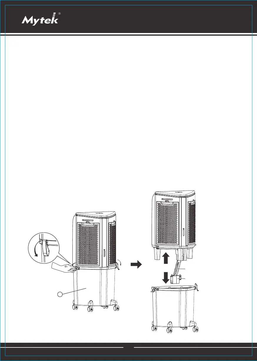 (2)(1)Use las hebillas ubicadas en los dos extremos del tanque de agua para enganchar la parte