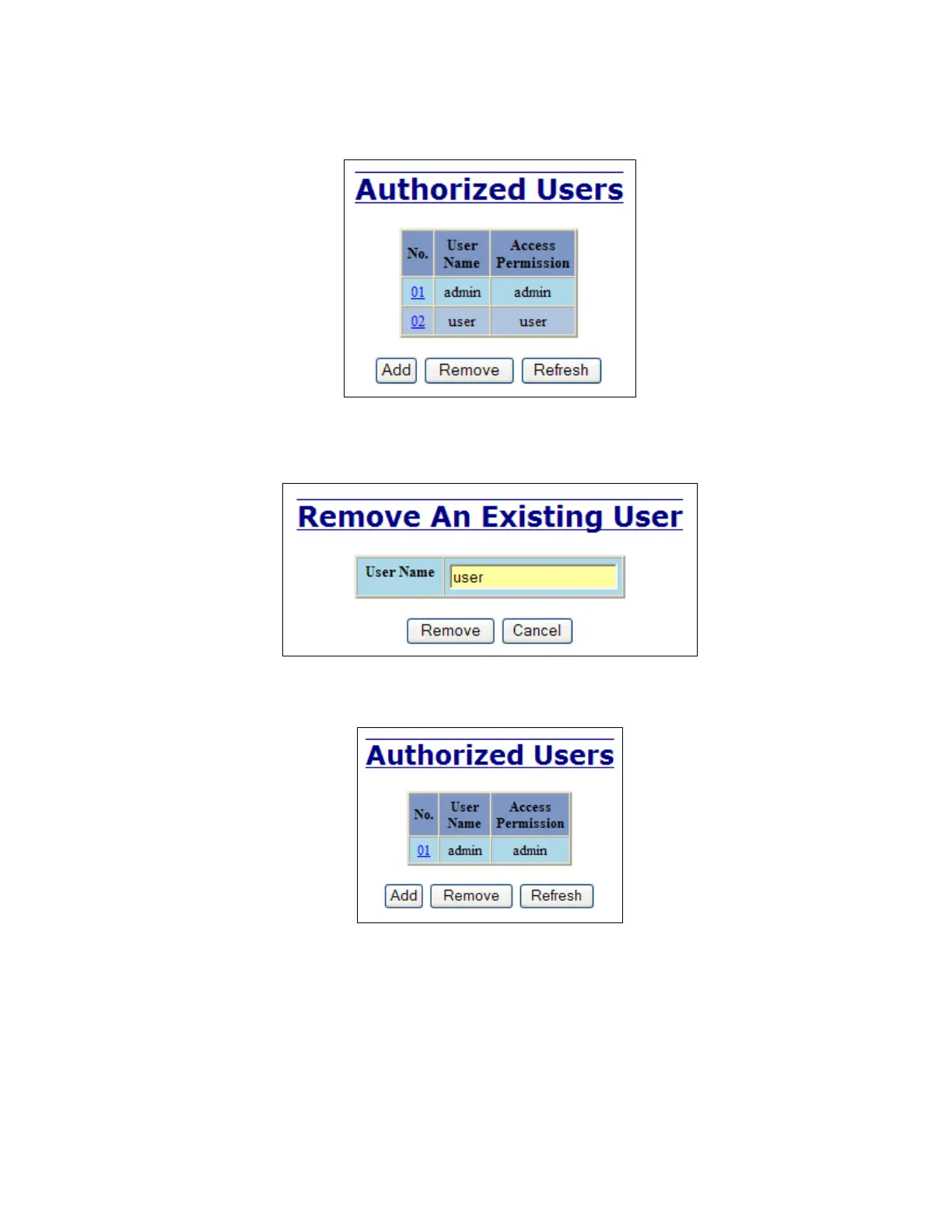 Following the Remove button on the above example, the administrator can remove a user by entering in the