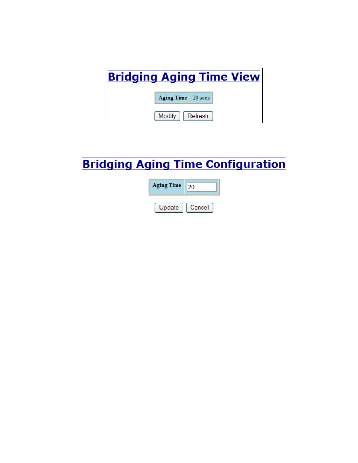 The Aging Time tab under the Bridging category will display the currently configured Aging Time. This