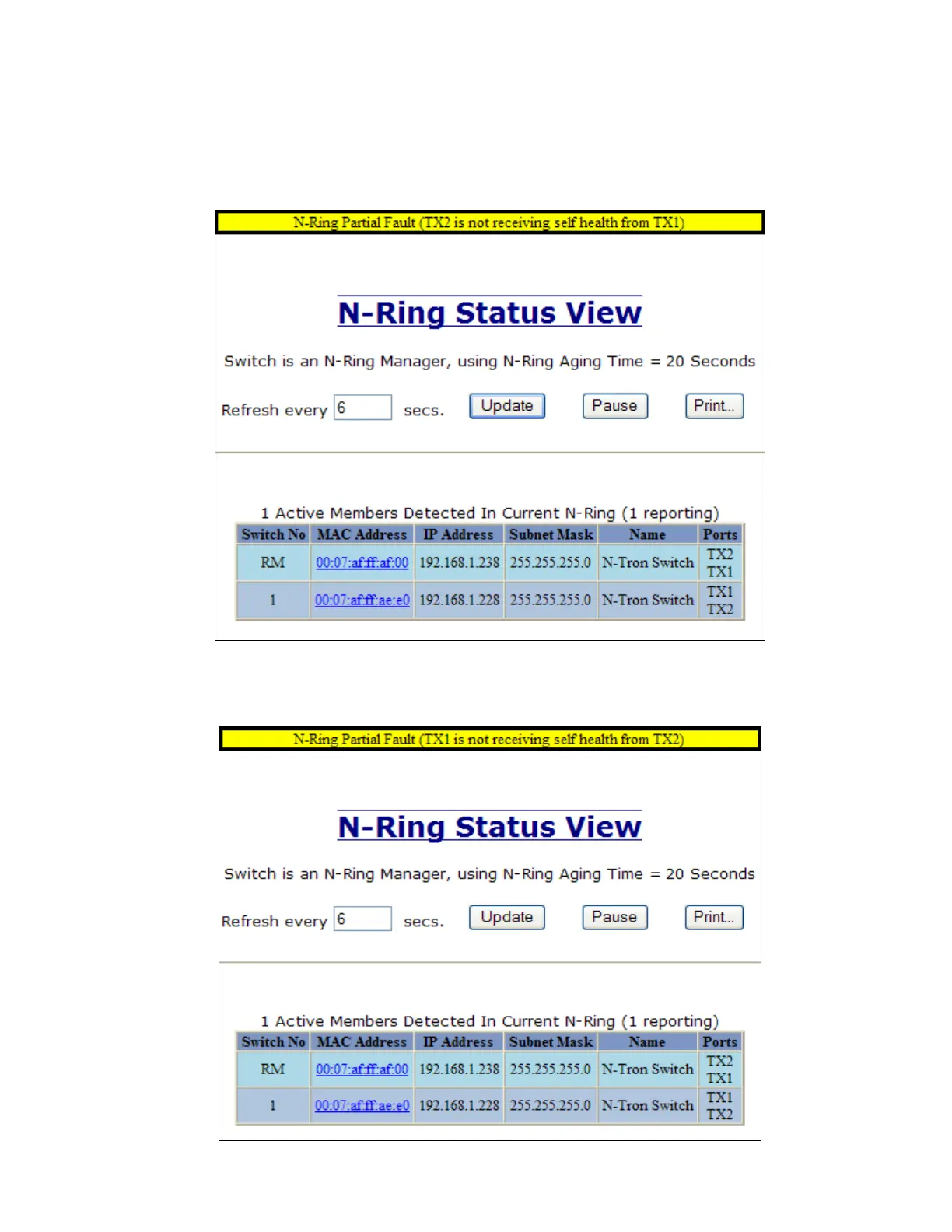 The screenshot below shows N-Ring Manager Status when a ‘Lower’ N-Ring Port (TX1 or TX7/FX1) is not