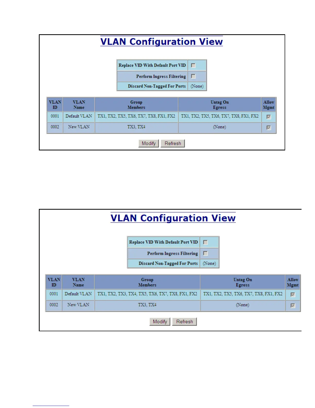 The ports of ”New VLAN” may be added back to “Default VLAN” to create overlapping VLANs.