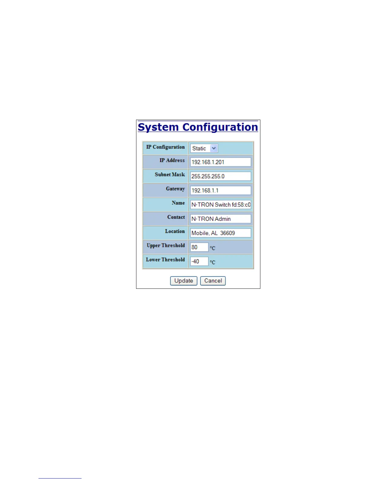 Address, Subnet Mask, Gateway, Name, Contact information, and the Location of the switch through the